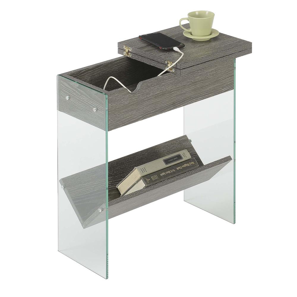 Take functionality to the next level with the SoHo Electric Flip Top End Table by Convenience Concepts. Features a flip top that opens to reveal enclosed storage and a charging station. Charging station includes two standard outlets and two USB ports. It also provides a cable management hole that allows you to place your device on the table without damaging your cord. The two tempered clear glass side panels create a magical illusion that the shelf is floating; giving it a modern contemporary style that will refresh your home decor. The top component and shelf are crafted from particle board that is finished with a rich melamine paper. This two tier unit is durable and easy maintenance. Set up in your living room; den or home study; its versatility is endless. Enjoy right after delivery with its simple 5 step assembly. Available in multiple finishes to easily complement your current ensemble. Pair with more pieces from the SoHo Collection by Convenience Concepts. Each sold separately.