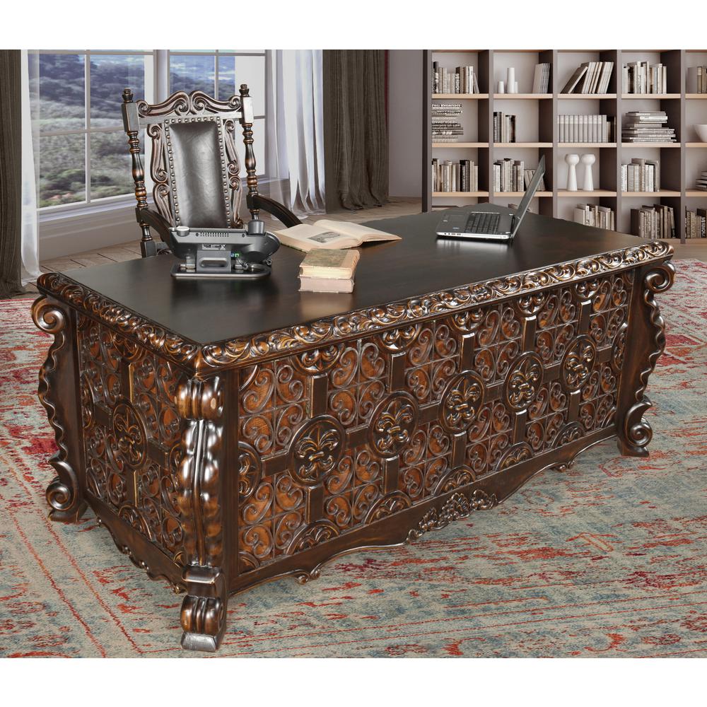 The Conquistador Leather Chair is a Spanish design rich in tradition that would be envisioned in a Grand Palacio, a Spanish court or today in a setting reminiscent of the periods as well as a perfect pairing with the Conquistador Desk or other similar office uses. It is hand carved in solid hardwoods and the Peruvian Leather that is used is noteworthy as they actually use full hide thickness. The chair is finished in a brown wood tone and has unique finished affects consistent with the era of the design and resulting from Peruvian finishing techniques of hand rubbing and exposing the rich wood undertones. The item is from the Santa Lucia Collection by AFD Home which consists of handmade, hand painted, and distressed solid wood furniture making each piece a timeless investment. Hand crafted treasures made one piece at a time, under one roof, by our exclusive family owned manufacturer from Lima, Peru. Their master artisans are skilled in furniture making techniques influenced by the Spanish during the colonization of Peru. Many items in the diverse collection feature specialty hand painted finishes that have also been passed on and perfected from generation to generation. The family strives to be environmentally friendly by using woods re-purposed from haciendas and old colonial homes as well as wood indigenous to South American forests, primarily mahogany, cedar, mean and requiem. If you are a lover of beautiful, find hill country rustic romantic, or find richness in Mediterranean lore, Then you too may fall in furniture love with this fine collection. The finished chair measures 28.00 x 24.00 x 28.00. No assembly required, arrives fully constructed.