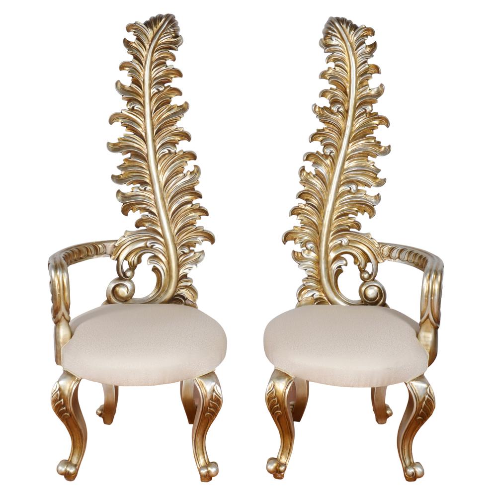 Platina Italia Leaf Chair Set of 2 each measuring 23 width x 22 depth x 61.5 inches tall. They are a beautiful example of a style of furnishings, originating in France about 1720, evolved from Baroque styling, This intricately carved Rococo designed chair set offers elongated backs with symmetrical carvings. The chairs are hand carved out of solid Mahogany that is then tastefully finished in our Platina finish and upholstered with an imported Silver Taffeta fabric. Another exclusive design and finish from the Heritage Collection, a division of AFD Home. A collection of fine, hand made furniture in the purest of standards of age old traditional crafting. Each piece is hand carved, one piece at a time, by some of the world's best carvers. The special Mahogany wood comes from replanted forests. The selected wood has been kiln dried. The item in its final form is stress and pressure tested prior to finishing to insure long lasting stability, in most climates, a Heritage Brand standard. The Platina finish series offers many accompanying items to these chairs that can be considered and combined to expand your desired interior. The chairs come fully assembled, a process of finer construction offering a more stable seating. Made by hand and imported from Indonesia.