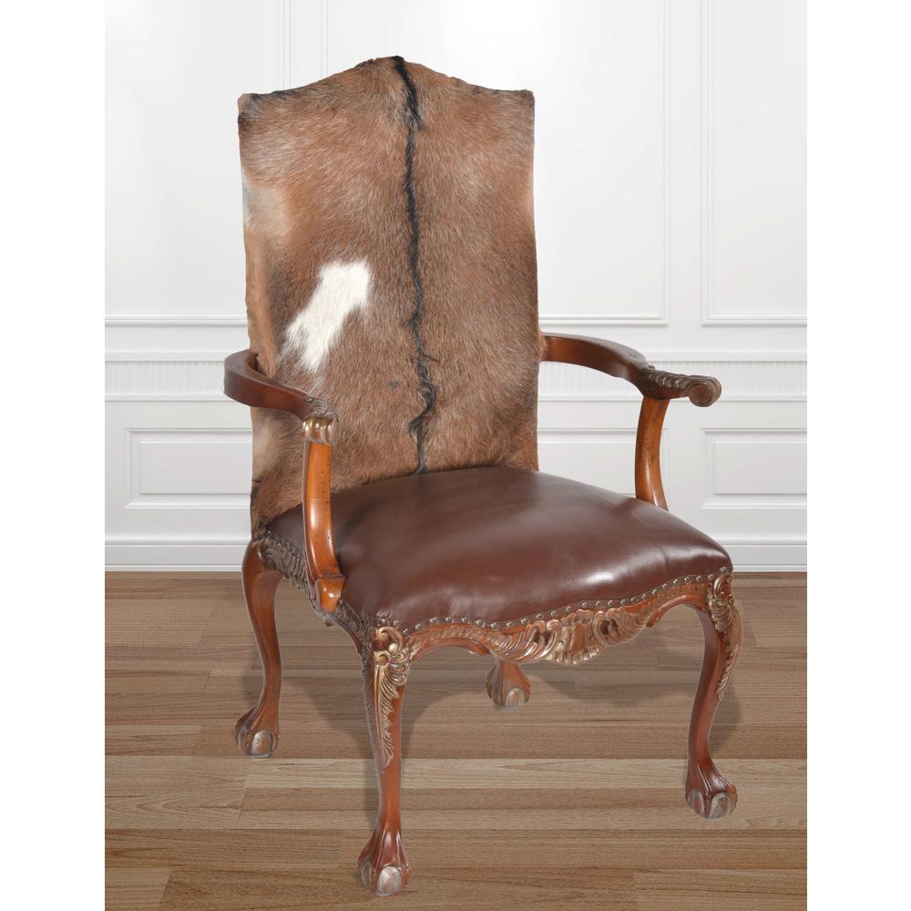 A very well defined and hand carved Chippendale Western Club Chair- VC from our Heritage Collection. A collection offering turn of the century European styling designed and scaled to showcasing American Standards. This beautiful chair took inspiration from Classic and Timeless Chippendale elements such as its claw and ball feet, its goose neck curved arms and the traditional carved shells and scrolls. Thomas Chippendale was a London cabinet-maker and furniture designer his designs reflected the British fashion for furniture of that period and are reproduced globally even today. Then combining this style with a western flair with natural hides and top grain rich brown leathers makes this a very desirable unique chair option. The natural hides and leather compliment the elegant Vintage Estate (VC) finish, a rich mahogany finish with a subtle grey wash rub, used to accent and enhance the details. The chair comes fully assembled and as such is very sturdy. The Heritage Collection is a fine hand made furniture collection in the purest of standards of age old traditional crafting. Each piece is hand carved one piece at a time by some of the worlds best carvers. The special Mahogany wood used comes from replanted forests, the selected wood has been kiln dried. The item in its final form is stress and pressure tested prior to finishing to insure long lasting stability in most all climates, a Heritage Brand standard. The final steps of hand making furniture is the application of the hand applied finishes. The specialty finishes used combine hand applied layering, glazing, padding ,distressing and crackling techniques and complete the beauty and value of owning timeless Heritage Furniture, a quality that will last for generations of ownership. Made by hand and imported from Indonesia.