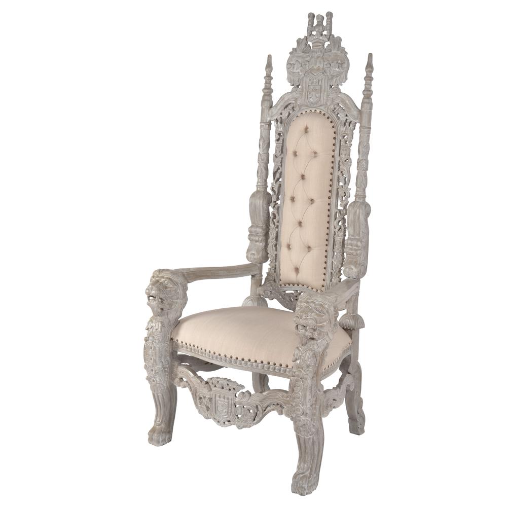 The Mystique Grey Royal Lion King Chair is a palatial 36 wide 28 deep x 72 tall inches. The chair is tall and impressive, and few chairs make more of a statement, with fine handcarved details on both the front as well as the back and carved regal lion masks flanking each arm, all of which adds to the prominence. This regal seat is fully upholstered and covered in a thick woven linen, which is neutral for ease of placement, and that works beautifully with the chairs specialty finish. The finish is Mystique Grey Mahogany, a trending tone, popular with many interior designers that lighten and lends richness in a soft yet luxurious way. The specialty finish used combines hand applied layering, glazing, padding, and distressing techniques. Heritage Furniture is built in a rare quality of yesteryear that will last for generations of ownership. The special Mahogany wood used comes from replanted forests; the selected wood has been kiln dried. The item in its final form is stress and pressure tested prior to finishing to ensure long lasting stability in most all climates, a Heritage Brand standard. Sold separately but often ordered in pairs for special uses as Wedding Throne Chairs, and while they are a solution to offer the feeling of luxury at special Events, these chairs can be purchased and appreciated by the select few for all times. The chairs are from the new Mystique Grey finish series, which offers many accompanying items that can be combined to expand your interior or collections. Made by hand and imported from Indonesia. This popular Throne Chair comes in several Heritage Finishes to choose from.