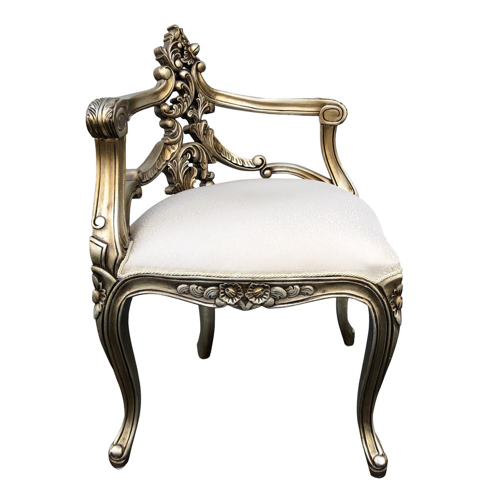 The Platine Venetian Corner Chair is an elegant 28.25 wide x 22.50 deep x 32 inches tall fine hand made mahogany chair. A perfect vanity stool or a corner chair. The smaller scale and corner shape combine with its intricate hand carved details to offer a style befitting the grand dame courts of Venice as well as multiple placements in Todays homes. Hand carved out of solid Mahogany that is then tastefully finished in our Platina finish and upholstered with an imported beautiful Cream Taffeta fabric. Another exclusive design and finish from the Heritage Collection, a division of AFD Home. A collection of fine, hand made furniture in the purest of standards of age old traditional crafting. Each piece is hand carved, one piece at a time, by some of the world's best carvers. The special Mahogany wood comes from replanted forests. The selected wood has been kiln dried. The item in its final form is stress and pressure tested prior to finishing to ensure long lasting stability, in most climates, a Heritage Brand standard. The Platina finish series offers many accompanying items to this settee that can be considered and combined to expand your desired interior. The chair comes fully assembled, a process of finer construction offering a more stable seating. Made by hand and imported from Indonesia.
