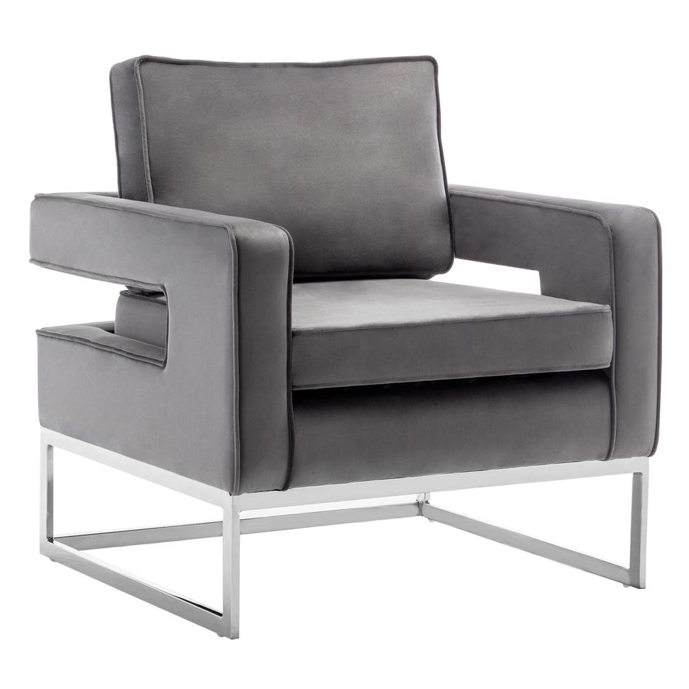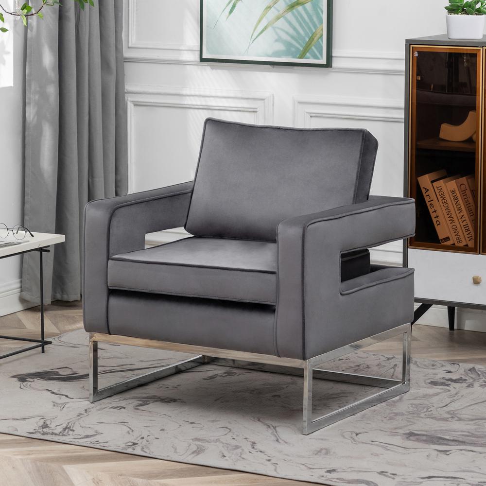 Fashionable and trendy, the Take a Seat Carrie Velvet Accent Lounge Armchair with Silver Base will put the finishing touches on any room needing that wow factor! Whether you’re piecing together your home whisky lounge or completing your insta-worthy sitting room, this is the last piece to the puzzle! Pair with current home furnishings or create a conversation corner with a set of two around an end table. The unique seat frame is built from solid and manufactured wood and upholstered in a smooth velvet fabric making it roomy, versatile, and sturdy. Square arms are delicately outlined with soft distinctive piping that wraps around the edges of the seat. The high-density filled seat cushion is held in place by Velcro and both the pillow and cushion can be detached for easy cleaning. Cushion covers are also removable making maintenance and cleaning even more convenient. Sleek powder-coated steel legs make this piece stand out above the rest while ensuring stability. Also included is a soft polishing cloth to maintain the beautiful finish of the silver chrome base. Check out the Take a Seat Collection by Convenience Concepts where this accent chair is available in different finishes and a gold base.