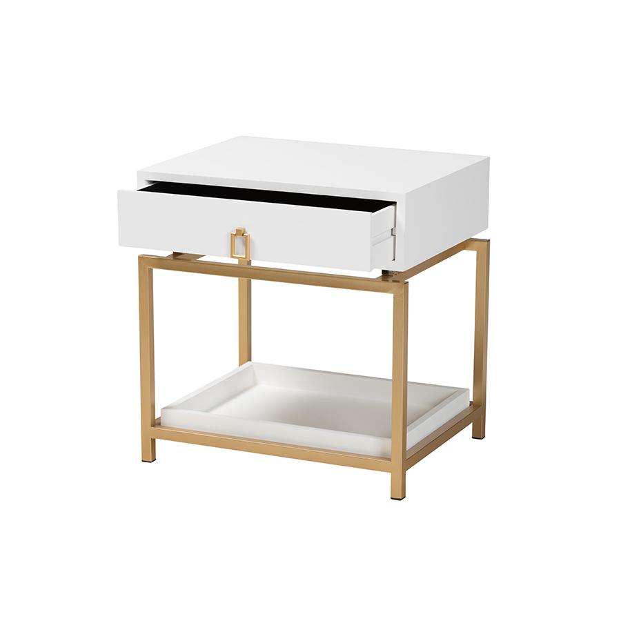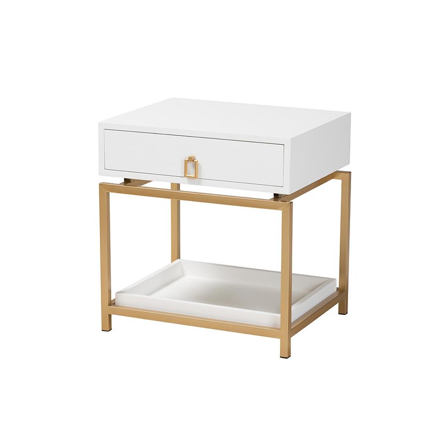 Glam and Luxe White Finished Wood and Gold Metal 1-Drawer End Table