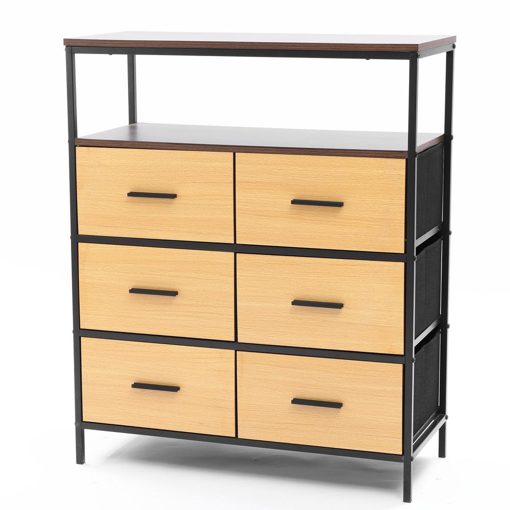 The contemporary inspired look of this beloved piece of furniture adds character and charm to any room of the home. The faux light wood drawer fronts are gorgeous and complement the dark faux wood of the tabletop and open shelf. The overall design of the chest creates a unique and versatile style that will incorporate into your modern, contemporary, or traditional interior designs instantly. The chest features a sturdy lightweight frame makes this unit easy to transport and when not in use, simply fold the fabric drawers flat for storage. Smart and stylish, this chest provides a smooth manufactured wood top for displaying your favorite lamp, photos, or alarm clock. While the open shelf below provides a convenient storage solution or display area. The six durable fabric drawers are convenient for storing and organizing your clothes, linens, and other household items. You will love the versatility and function of this chest - perfect for your bedroom, guest room, or office. The chest is so easy to assemble with hardware and instructions provided.