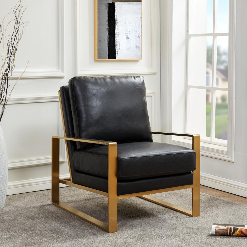 LeisureMod Jefferson Leather Modern Design Accent Armchair With Elegant Gold Frame, Black