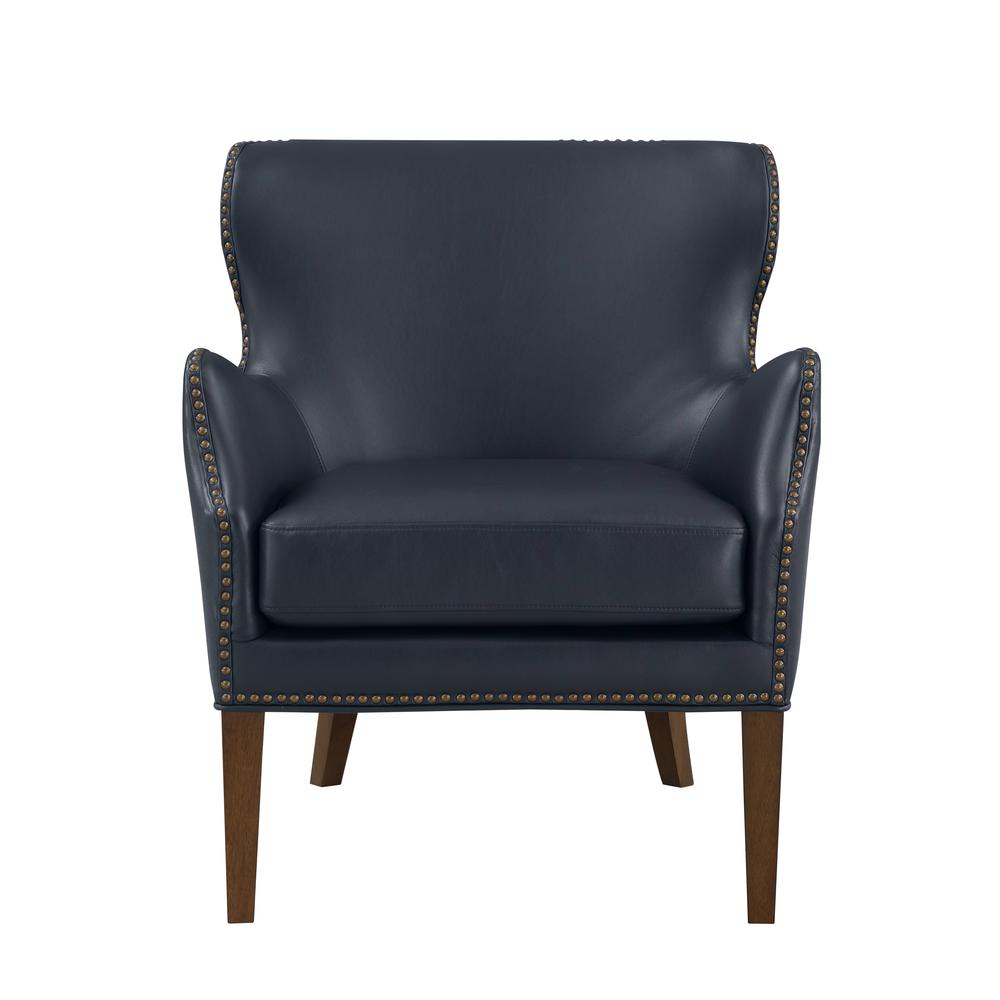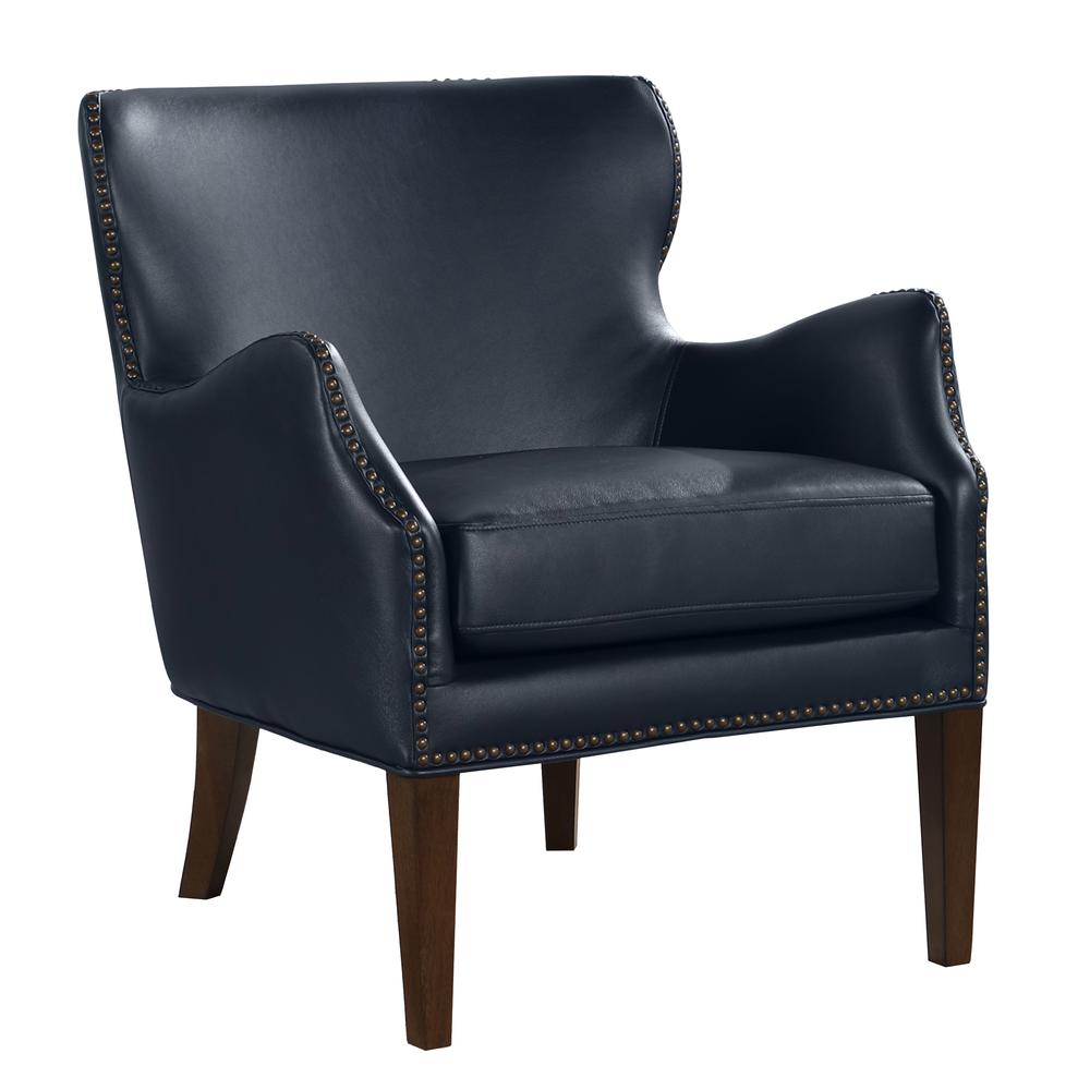 Elevate your relaxation and transform your living space with our Dallas Arm Chair. Designed with your comfort and style in mind, this chair is the perfect addition to your home. Crafted with hardwood and plywood frame construction, this chair ensures long-lasting durability and support. Enjoy the embrace of a comfortable, contoured backrest that provides optimal support and relaxation. The elegant sloped arm design adds a touch of sophistication to your space. Our chair features faux leather upholstery, offering the luxurious look and feel of top grain leather but easy to maintain. Sinuous "no sag" springs provide cushion support, while a high-density foam 6 inch thick seat cushion, ensures supreme comfort. Kiln dried solid wood legs provide stability and durability, ensuring your chair stands the test of time. Antique brass nail head trim adds a touch of classic elegance to your chair. Hassle-free set up, simply attach the legs and you're ready to relax in style! Available in your choice of Midnight Blue, Deep Brown, or Saddle faux leather.