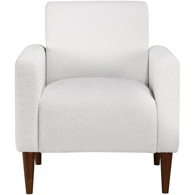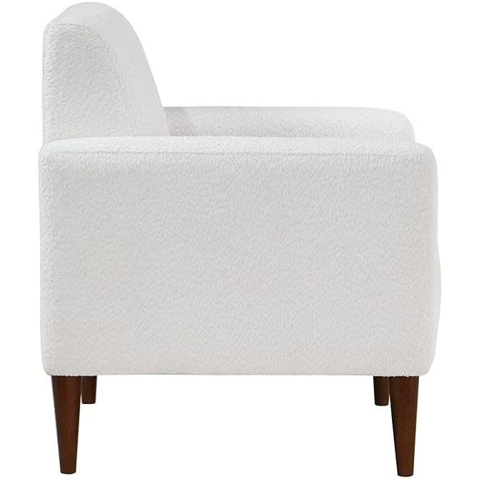 Envelop yourself in pure comfort with our Cumulus Arm Chair, featuring milky white boucle fabric upholstery that exudes modern elegance. Built with a combination of solid wood and plywood, the Cumulus chair ensures a durable and reliable foundation for your moments of relaxation. Solid tapered wooden legs not only provide a touch of sophistication but also offer stable support, making this chair a chic addition to any space. Equipped with floor glides, the Cumulus Arm Chair takes care of your floors, allowing you to rearrange your space with ease. Sink into luxury with pocket springs and foam seating, delivering a perfect blend of support and comfort. The Cumulus accent chair features a simple assembly process, ensuring you can unwind and enjoy its comfort with minimal effort. Elevate your living space with the Cumulus Modern Arm Chair - where style meets serenity!