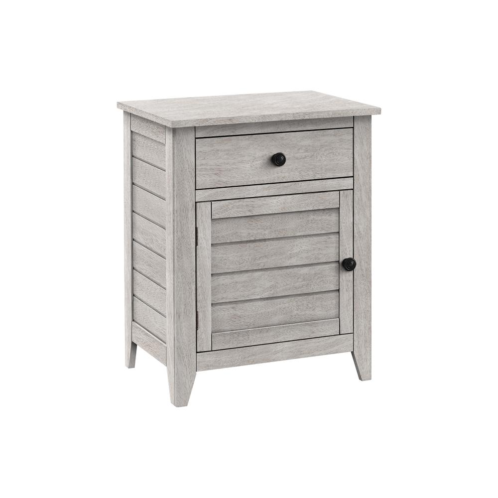 Bring in the perfect combination of style and functionality to a room with this 25 inch high side accent table. Designed in a transitional style with coastal inspiration, this space saving table is finished on all sides in a breezy washed grey veneer for a casual relaxed look. Place a table lamp and some decorative accessories on the spacious, easy to clean top and set it next to a sofa or chair as an end or side table in a living room or use it as a nightstand in the bedroom. Offering plenty of storage with a drawer and a closed cabinet with clapboard paneling on the front and sides, and complemented with simple black metal knobs, this durably designed table will be a the most practical furniture piece you will own. Easy to assemble with all parts and illustrated instructions included, this table is backed by a 5 year limited warranty against manufacturer's defects for your confidence and many years of enjoyment.