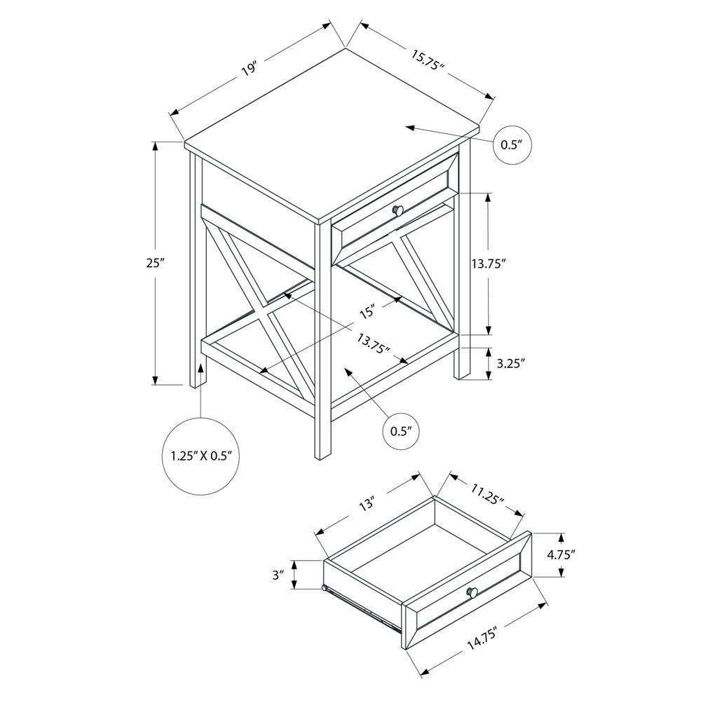 Bring the perfect combination of style and functionality to a room with this 2 tier, 25 inch high accent table. Designed in a transitional style, this space saving side table is finished in a chic black veneer with hints of red peaking through on all sides and accented with an x-design at each end for an upscale casual look. Place a lamp and some decorative accessories on the spacious, easy to clean top and set it next to a sofa or chair as an end table in a living room or use it as a nightstand in a small bedroom for a fresh look. Offering plenty of storage with a paneled drawer on smooth metal glides and complemented with a simple light gold knob, as well as a convenient bottom shelf for additional storage and display space. Easy to assemble with illustrated instructions, all parts and floor protectors included, this durably designed table is backed by a 5 year limited warranty against manufacturer's defects for your confidence and satisfaction.