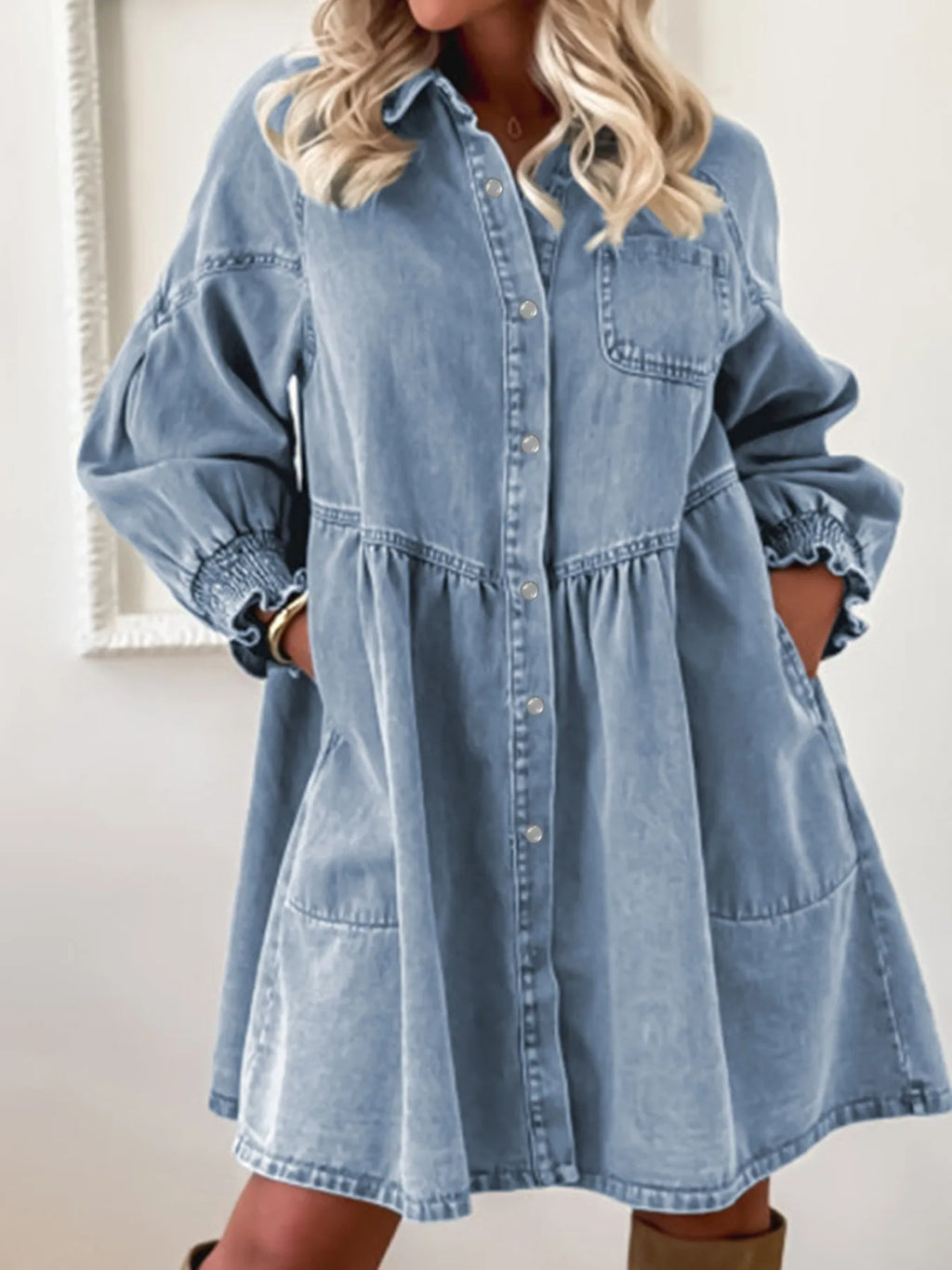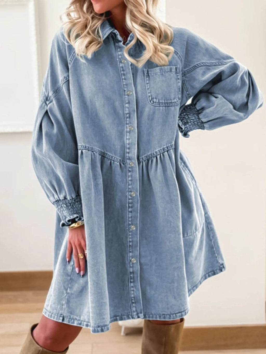 Button-Up Denim Shirt Dress with Smocked Cuffs