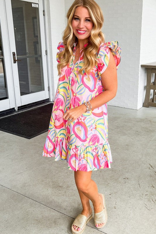 Floral Ruffle Trim Flutter Sleeve Buttoned Dress