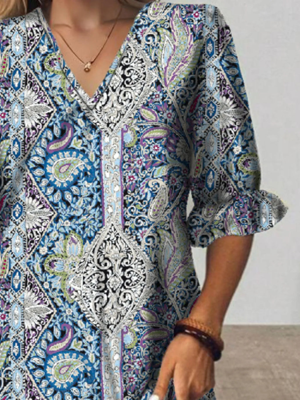 Full Size Bohemian Paisley Print V-Neck Midi Dress Plus Size