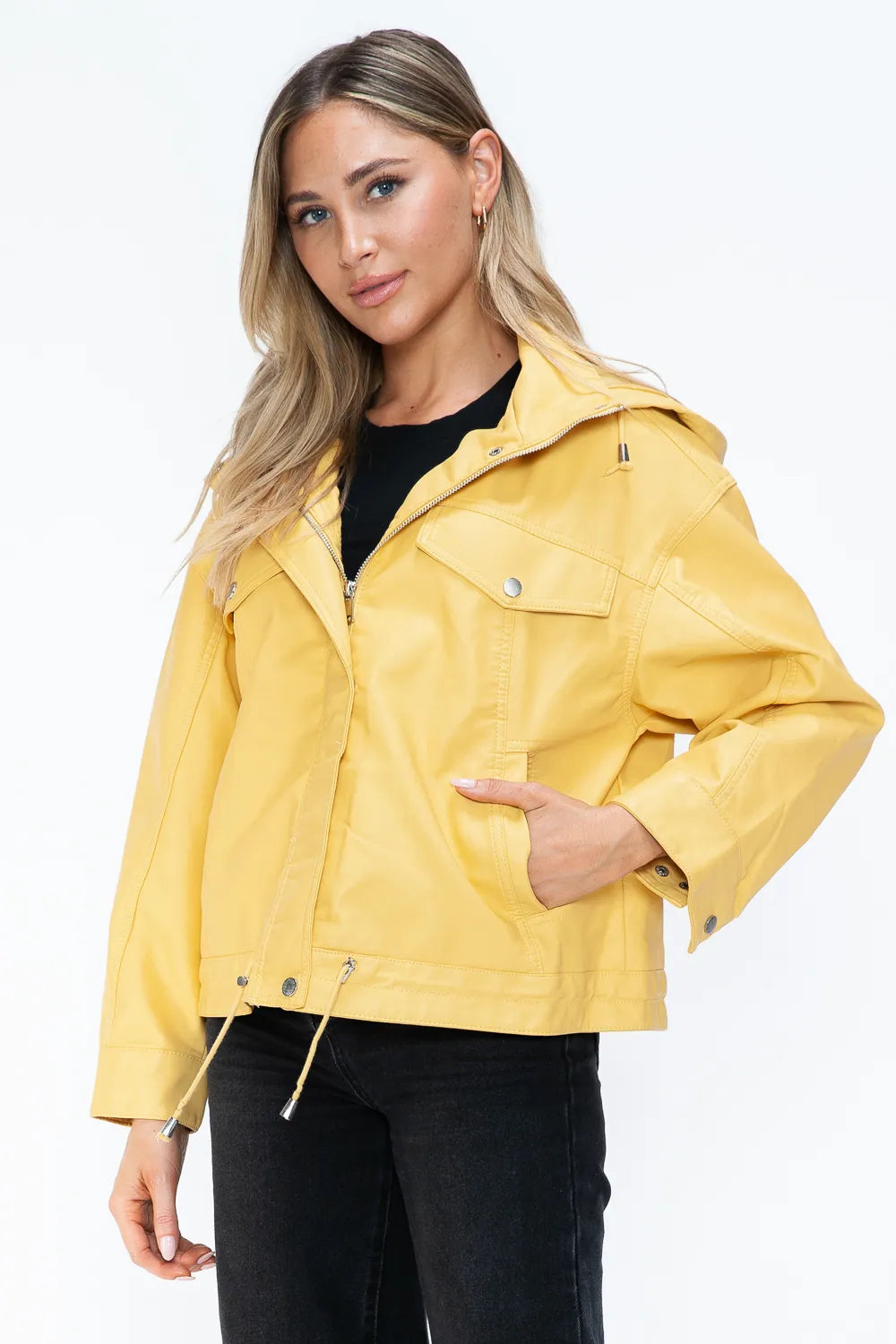 How Dare U Drawstring Hem PU Leather Zip Up Jacket