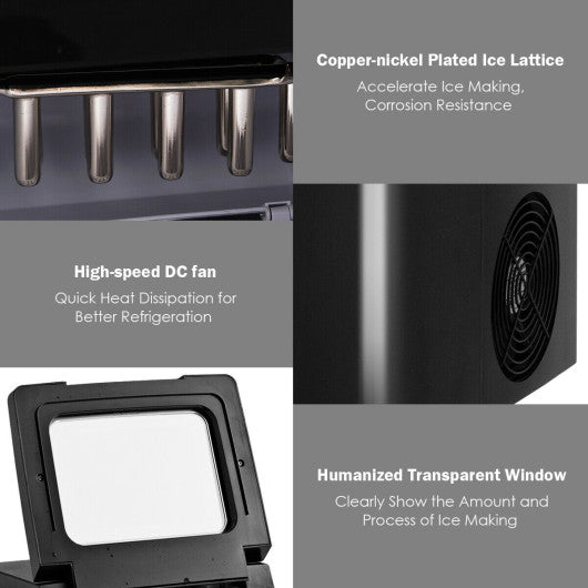 - â— Humanized Design: Designed with a high-speed DC exhaust fan heat dissipates quickly for a better cooling effect. In addition the transparent window allows you to easily see the progress and amount of ice in the machine. It comes with an extra ice scoop and a removable ice basket all of which are incorporated to bring you the best ice-making experience.