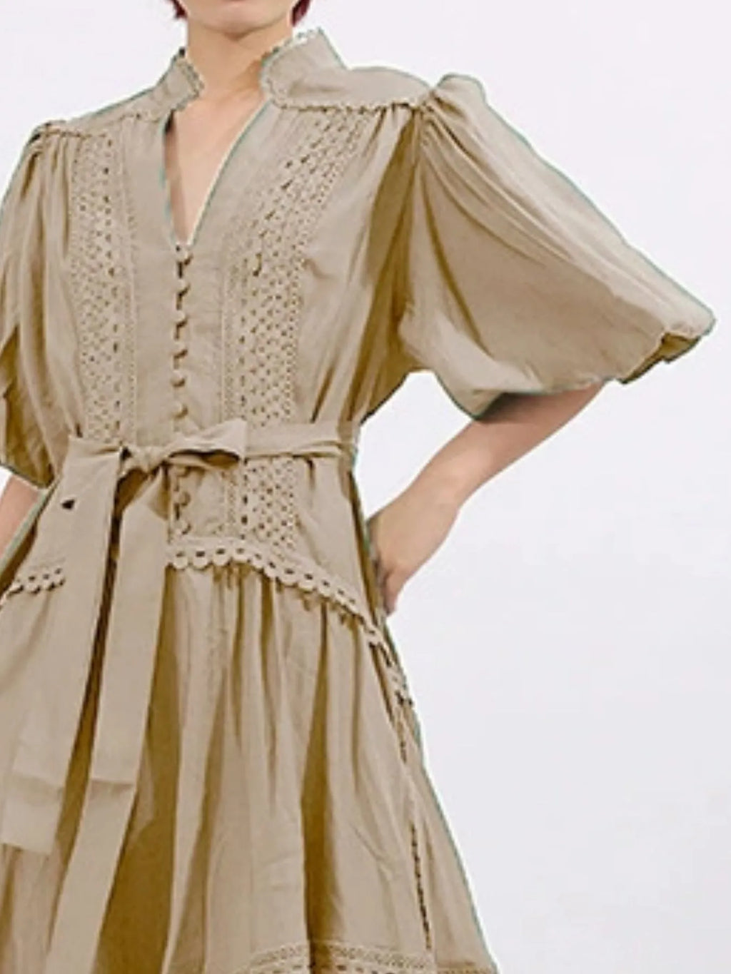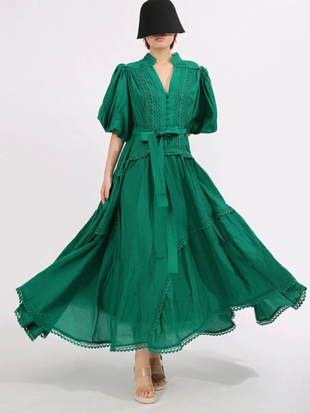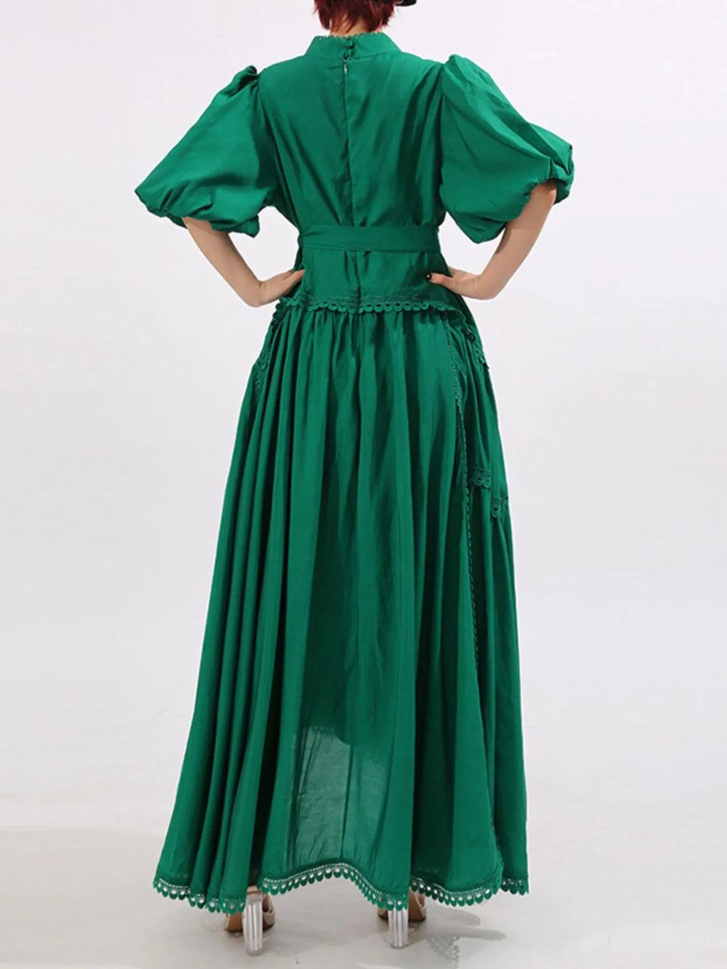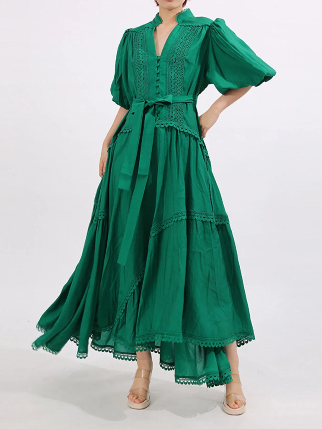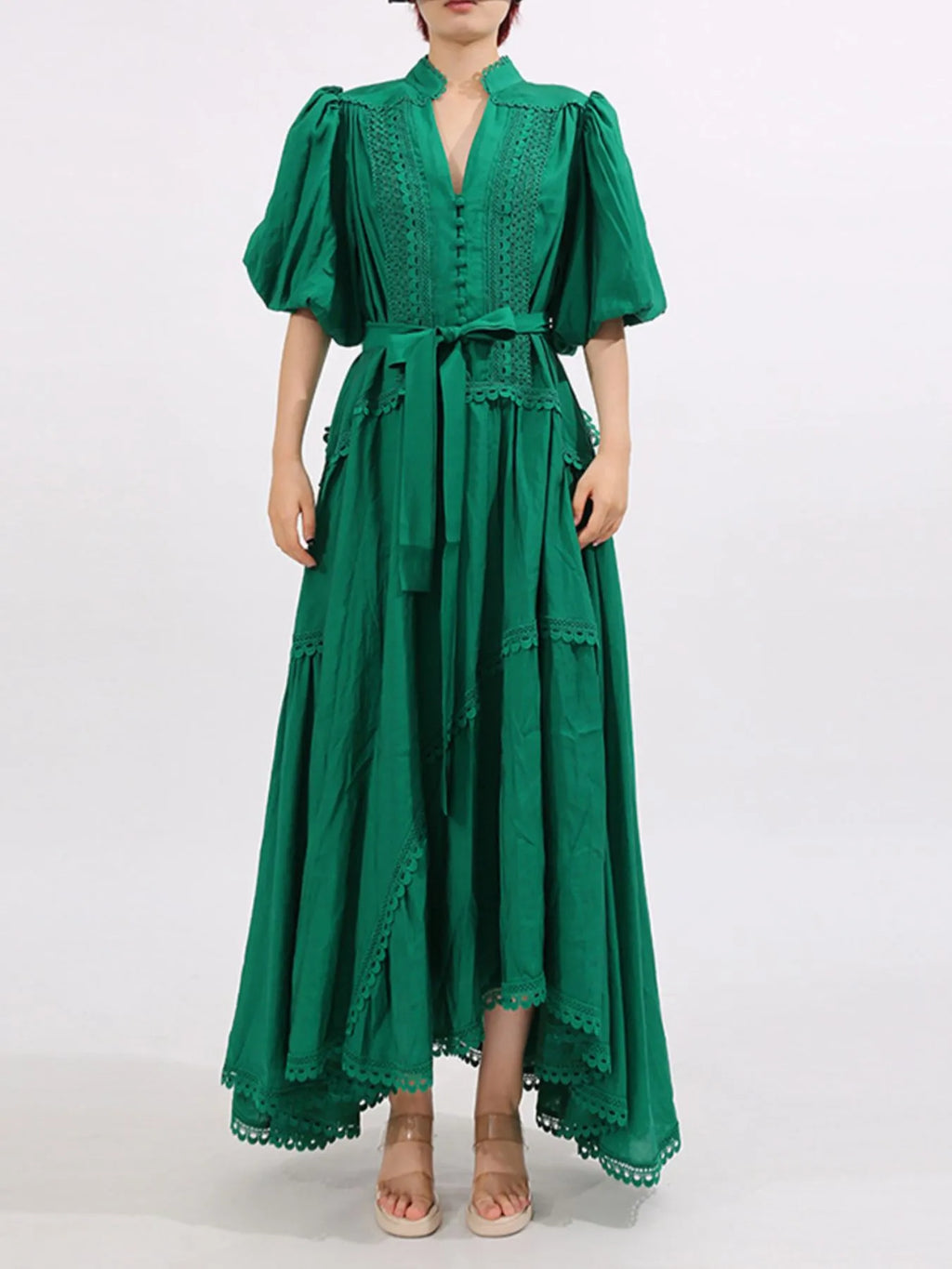 Lace Detail Notched Puff Sleeve Maxi Dress