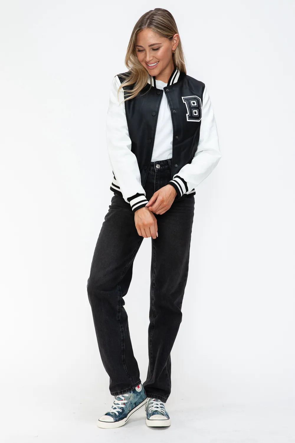 Love Me Now PU Leather Contrast Snap Down Bomber Jacket