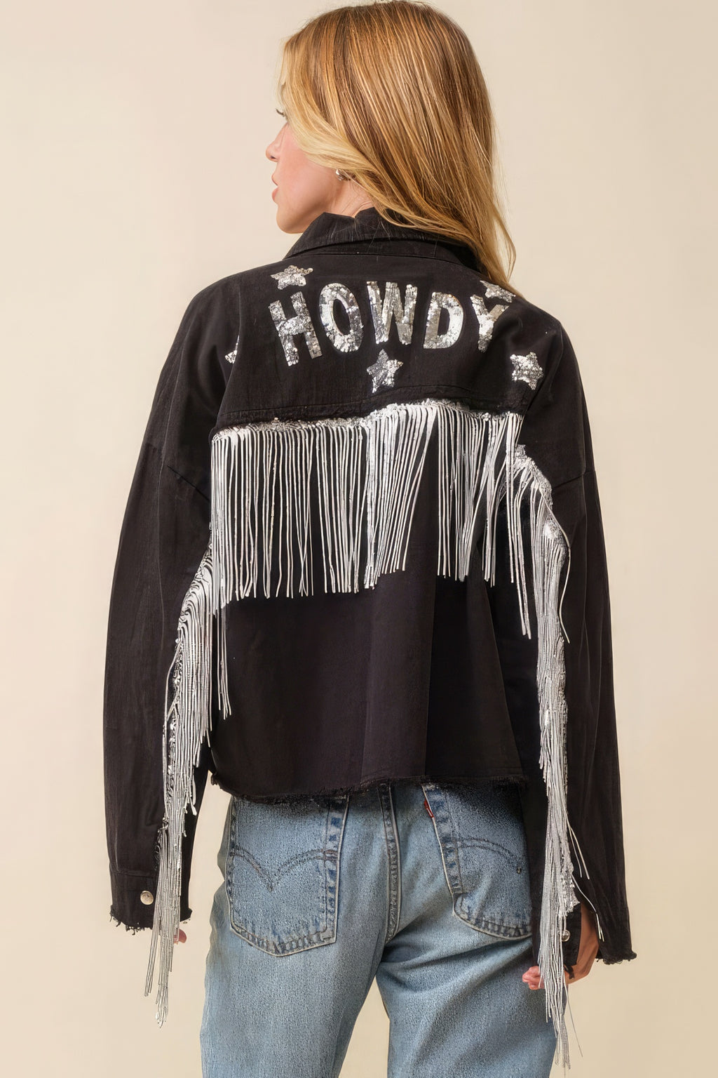 Saddle up and make a statement with the Howdy Sequin Fringe and Star Patches Jacket. Add it to your cart now and let your Western spirit shine through!