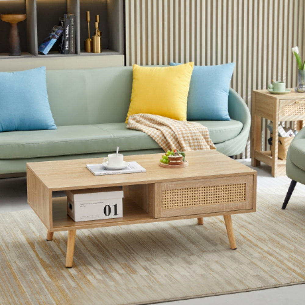 The Rattan Coffee Table features a modern design with a durable MDF body, complemented by rattan woven door panels and solid wood legs. The smooth rattan material ensures safety, while the adjustable PVC feet enhance stability. The combination of materials provides a sturdy and attractive piece that fits seamlessly into various interior styles.