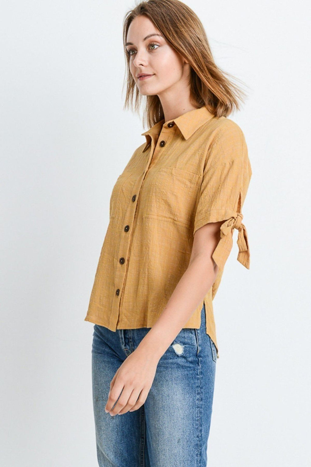 Add the Short Sleeve Button Up Top with Tie Sleeves in Mustard to your cart now and elevate your wardrobe with this effortlessly chic and comfortable piece!