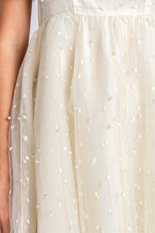 regular size, standard, young, contemporary, mesh, pearl, babydoll, dress, mini dress, short dress, square neck, puff sleeve, short sleeve, low back, elastic, back zipper, lining, lined, trendy, cute, stylish, fashionable, comfortable, daily wear, date wear, picnic wear, romantic, Easter, princess, spring, summer, ss, women's clothing, women's apparel, women's wear