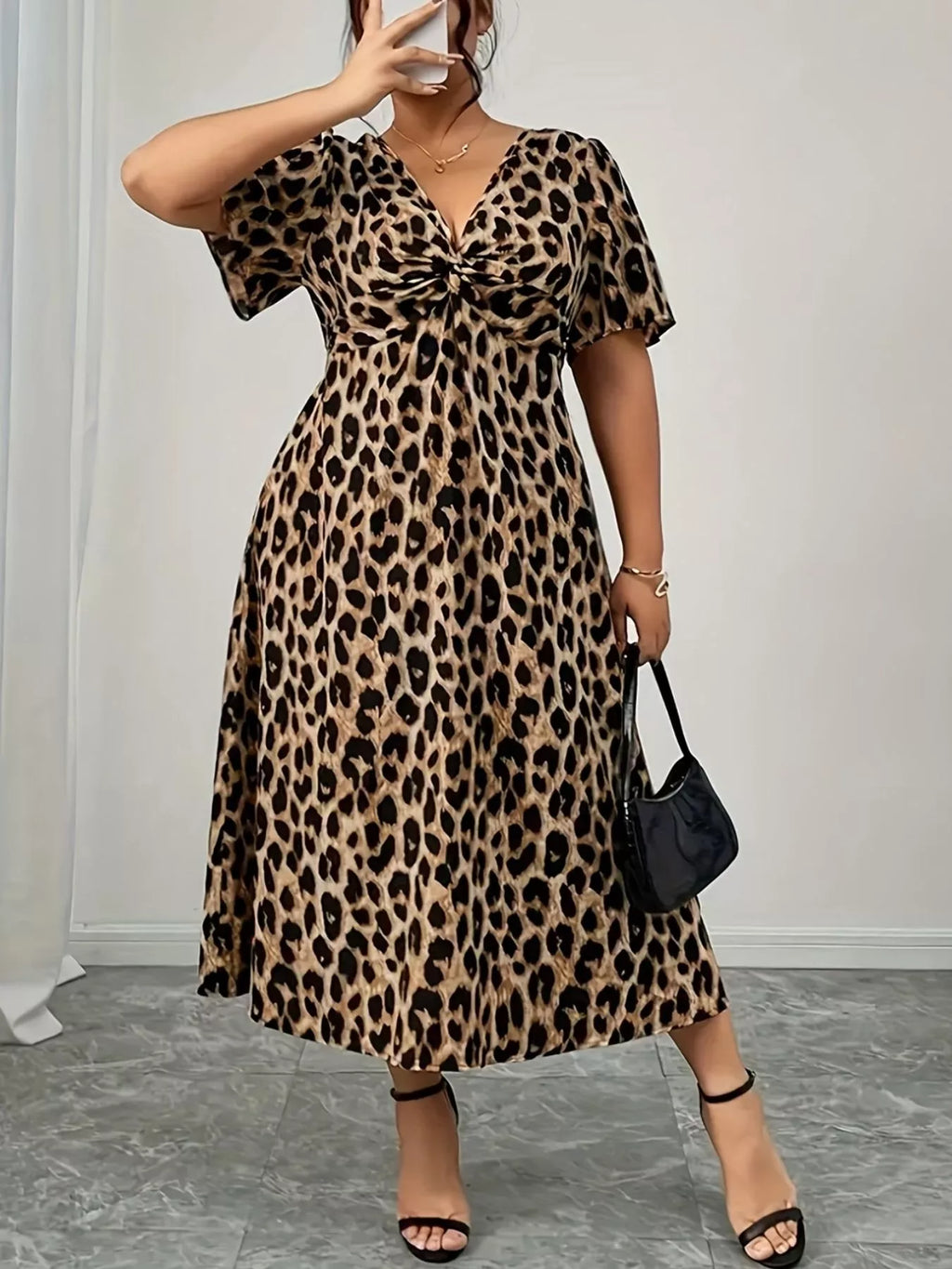 Plus Size Twisted Front Leopard Short Sleeve Dress