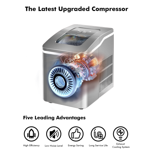 Quiet Operation: Coming with 45 dB low noise operation this electric ice making machine will not disturb your daily work and activity while achieving low consumption. And the evaporators are made of pure copper with plating which are highly efficient and durable.