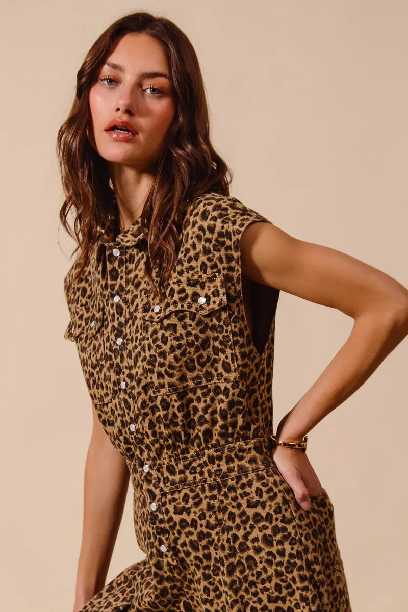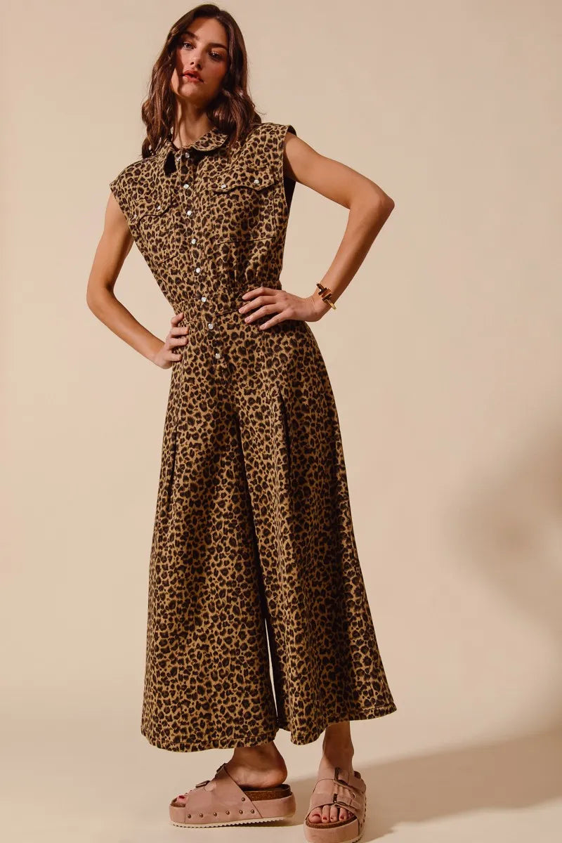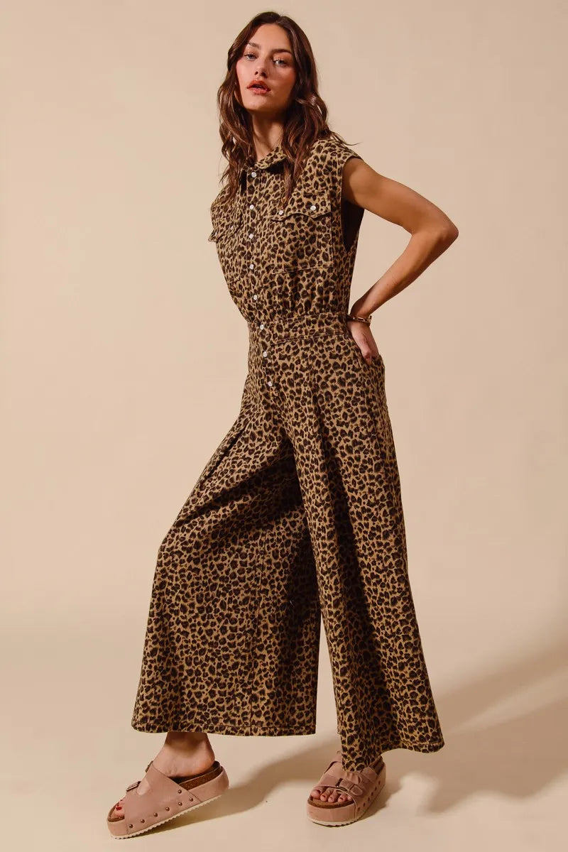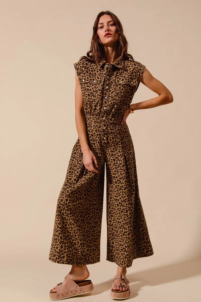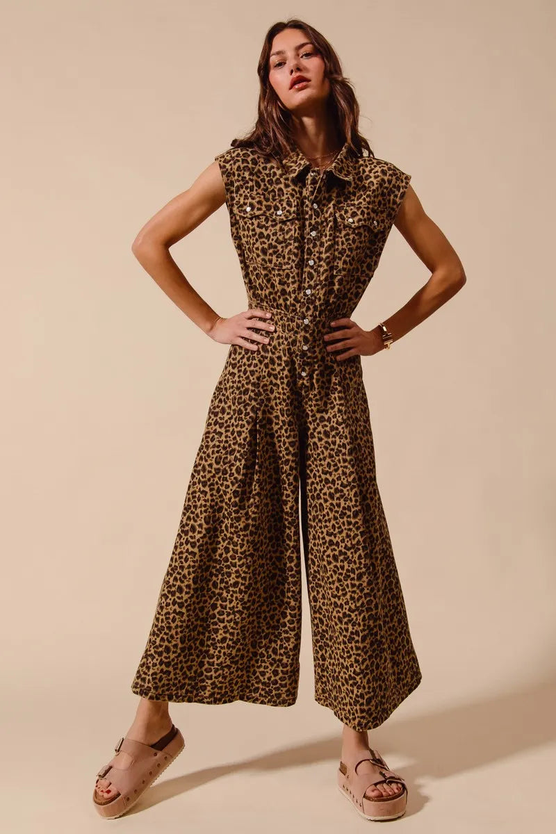 This stunning leopard print jumpsuit features a sleeveless design perfect for warm weather styling. Made from lightweight, flowing fabric that drapes beautifully, it offers both comfort and style. The wide-leg silhouette creates a flattering elongated look while the button-front closure and collared neckline add sophisticated details. The removable belt cinches the waist for a defined silhouette, and the cropped ankle length keeps the look modern and fresh. The bold leopard print makes this piece a statement wardrobe essential that can be dressed up with heels for evening or down with sandals for casual chic.