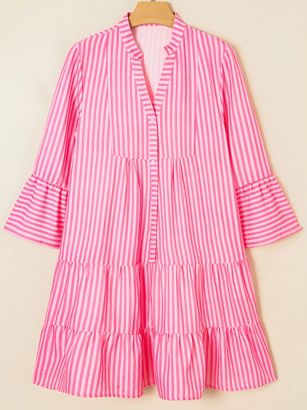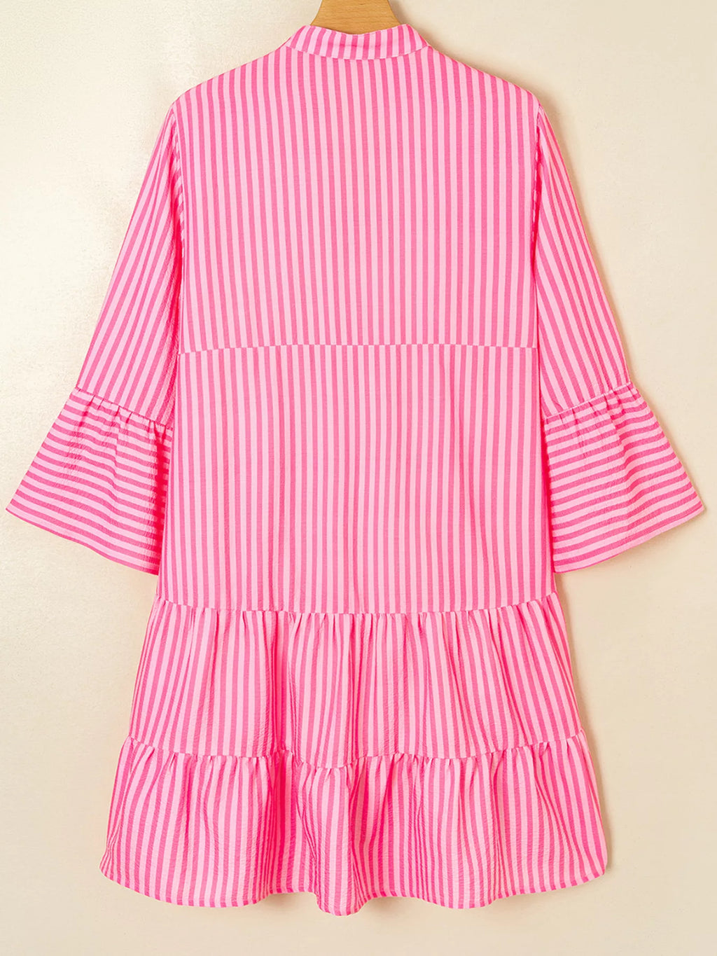 Stripe Flare Sleeve Half Placket Tiered Flowy Mini Dress