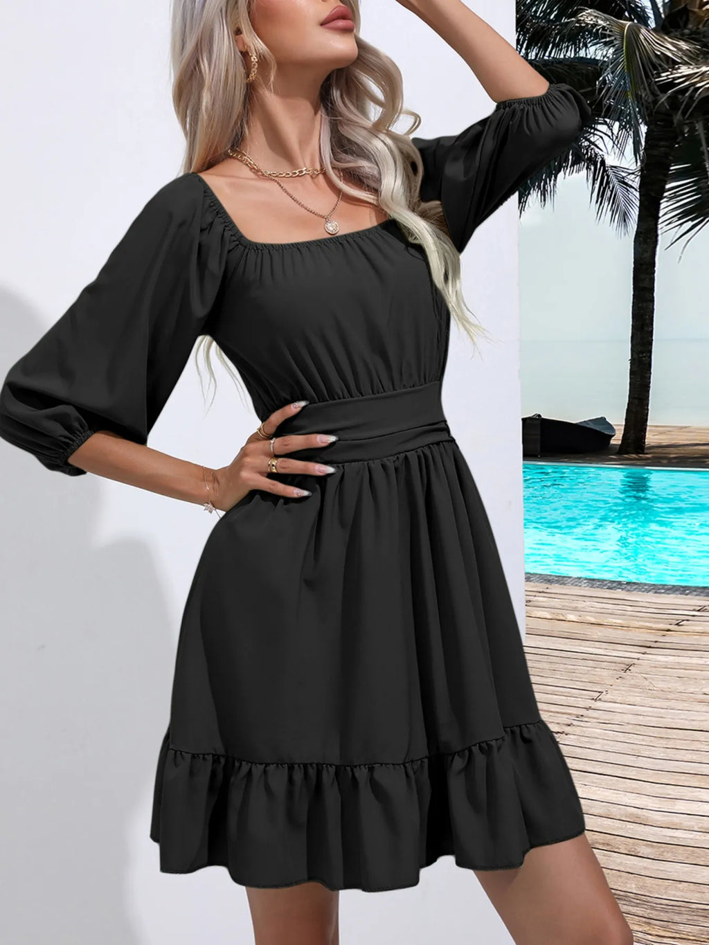 Tie Back Ruffled Hem Square Neck Dress