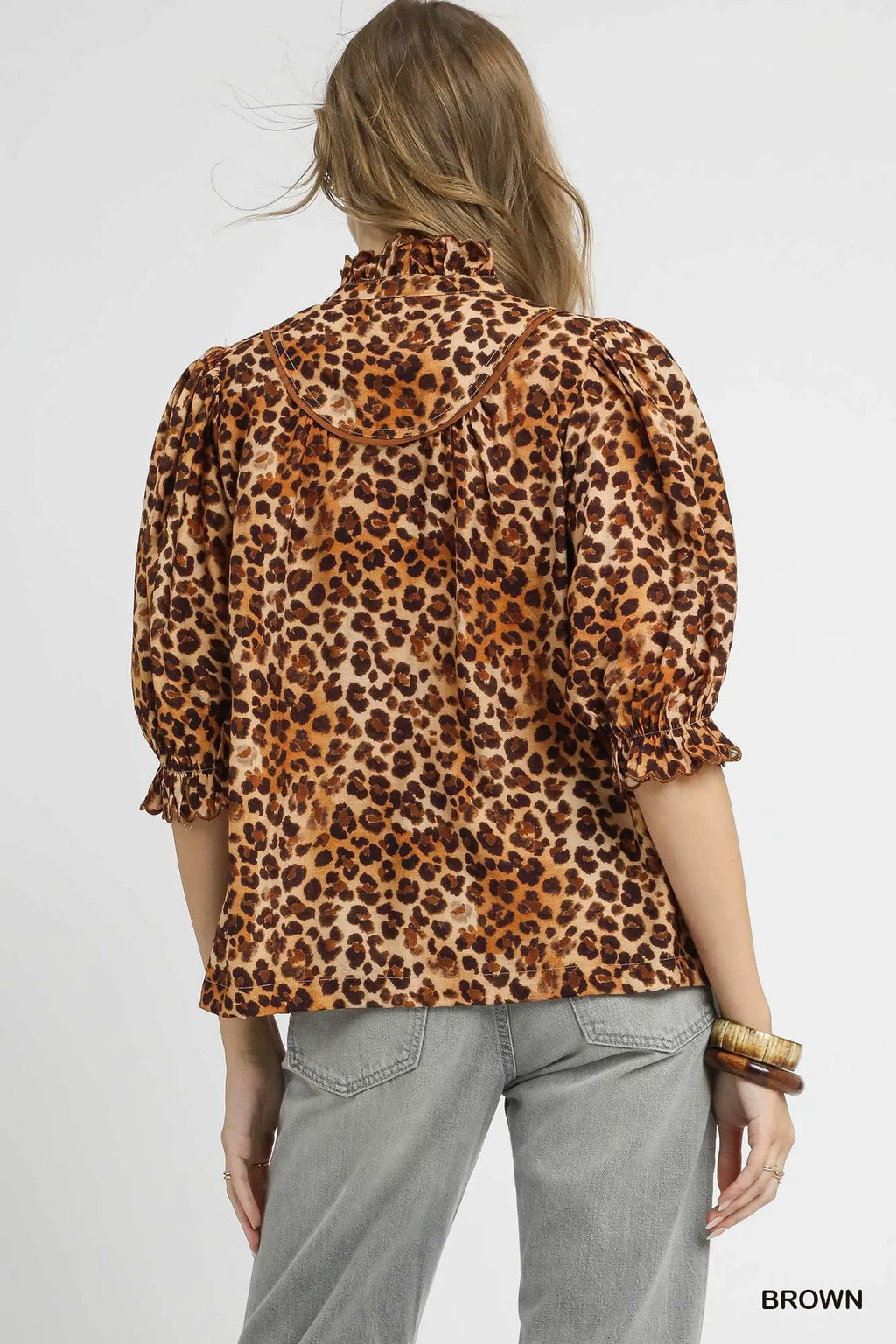Umgee Full Size Leopard Print Ruffle Neck Blouse Plus Size