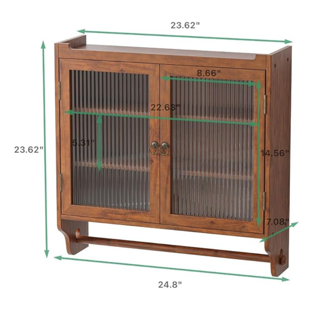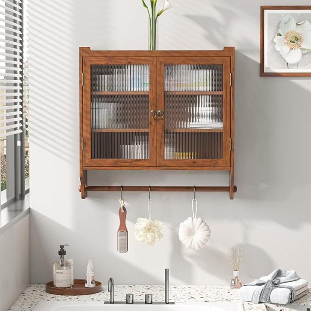 Additionally, the cabinet includes a built-in towel rack at the bottom, perfect for hanging towels in the bathroom or kitchen. This added feature enhances the functionality of the cabinet, providing a convenient spot for drying or displaying towels. Combining vintage charm with modern convenience, this wall cabinet is not only a practical storage solution, but also an attractive piece that enhances the aesthetic of any room.