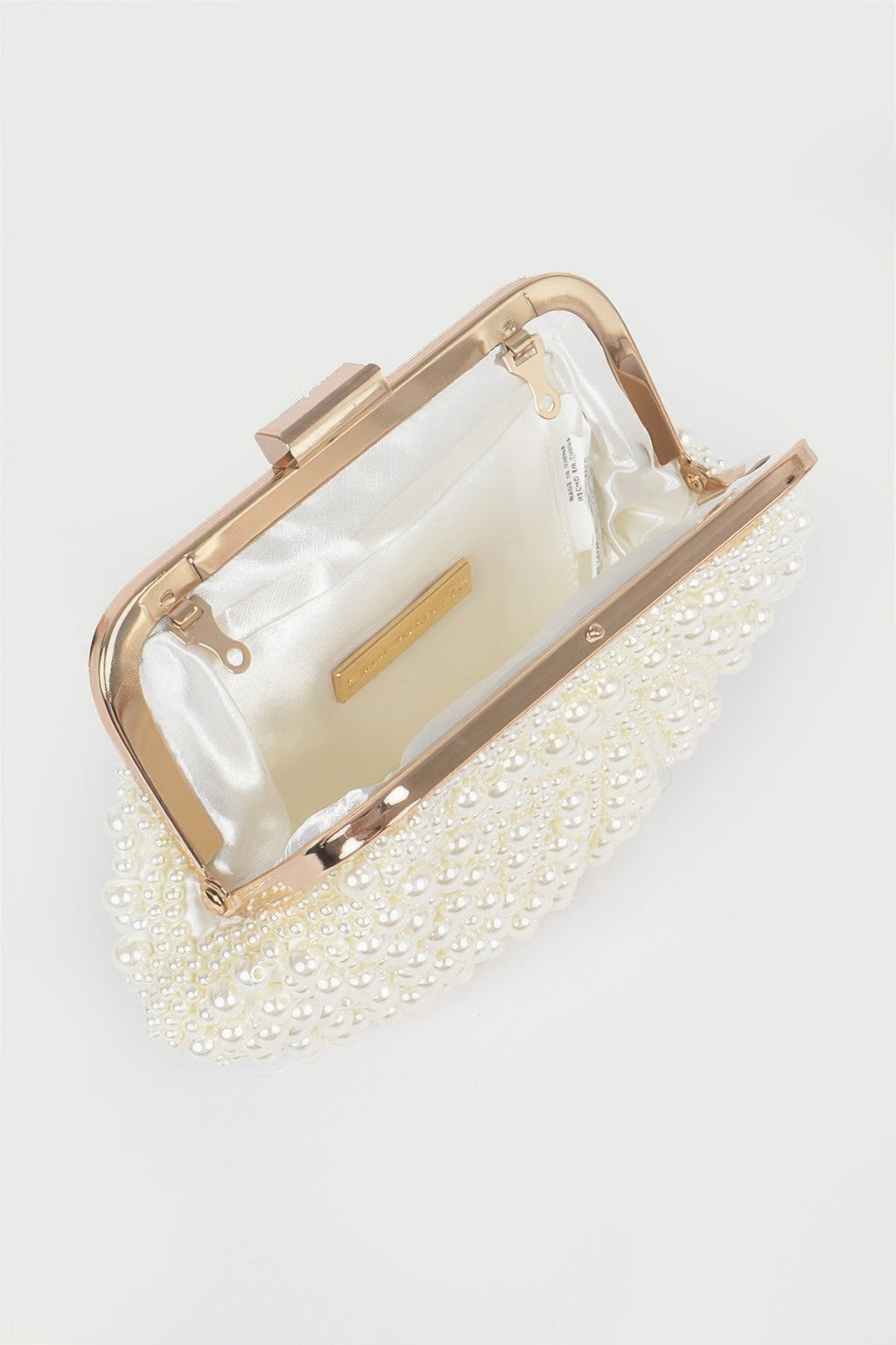 Elegant and meticulously crafted, the Handmade Pearl Clutch is a timeless piece that brings sophistication to any occasion. Adorned with glistening faux pearls and accented with luxe golden chain details, this clutch captures the essence of refined glamour. Its compact silhouette is perfect for carrying your evening essentials, while the handcrafted finish adds a unique touch of artistry. Whether paired with a formal gown or a sleek cocktail dress, this clutch is a statement of grace and elegance.