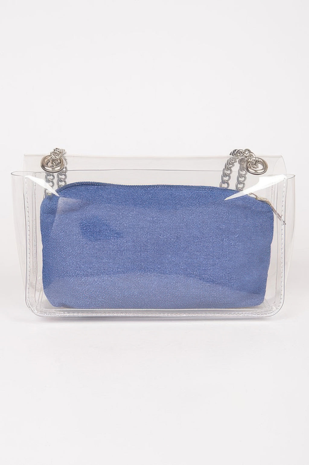 Stylish and event-ready, the Clear Bag with Denim Pouch blends fashion and function for on-the-go convenience. Featuring a transparent PVC outer shell and a removable denim-textured pouch, this versatile piece offers secure storage while keeping essentials in view. The sleek chain strap adds a touch of polish, making it easy to wear crossbody or on the shoulder. Perfect for music festivals, concerts, or venues with clear bag policies, it combines practical design with a casual-cool aesthetic. Whether you're dressing for an event or a day out, this bag keeps you organized without sacrificing style.