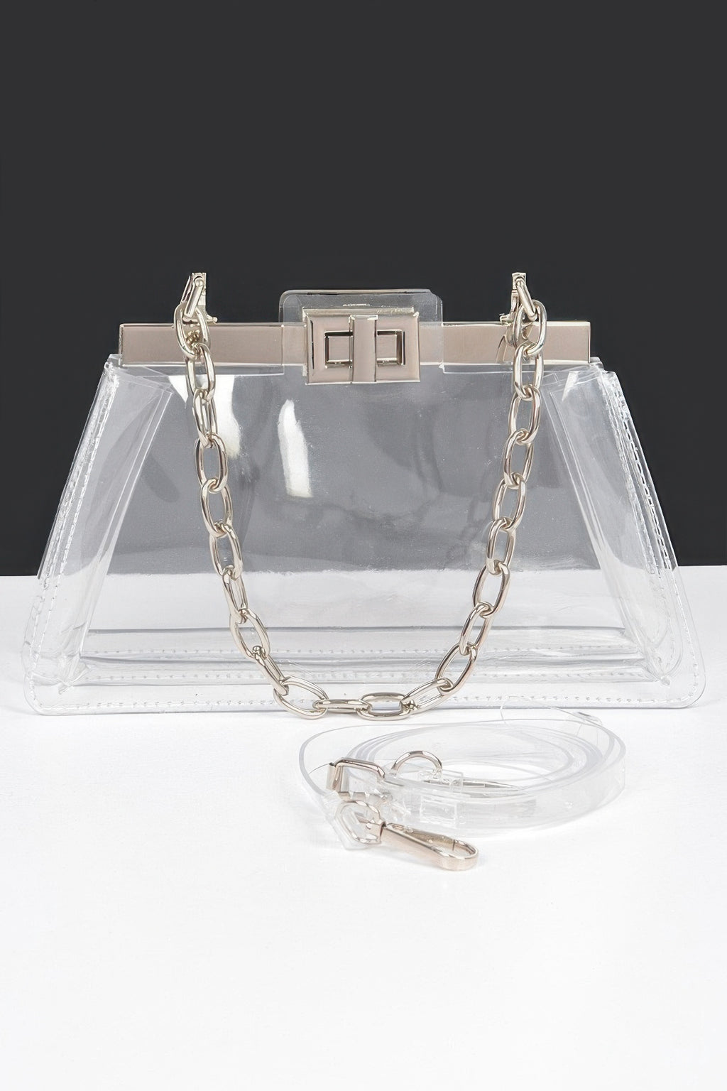 Add the Transparent Double Pocket Chain Handle Clutch to your collection now and step out in style!