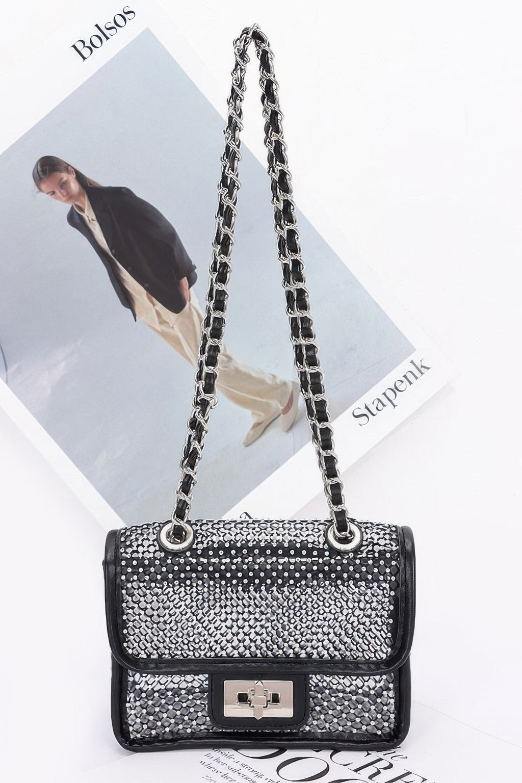 This bag stands out with its stunning rhinestone detailing and sleek metal accents, offering the perfect balance of elegance and practicality. Whether you're dressing up for a special event or looking to add a glamorous touch to your everyday style, this bag is the perfect choice.