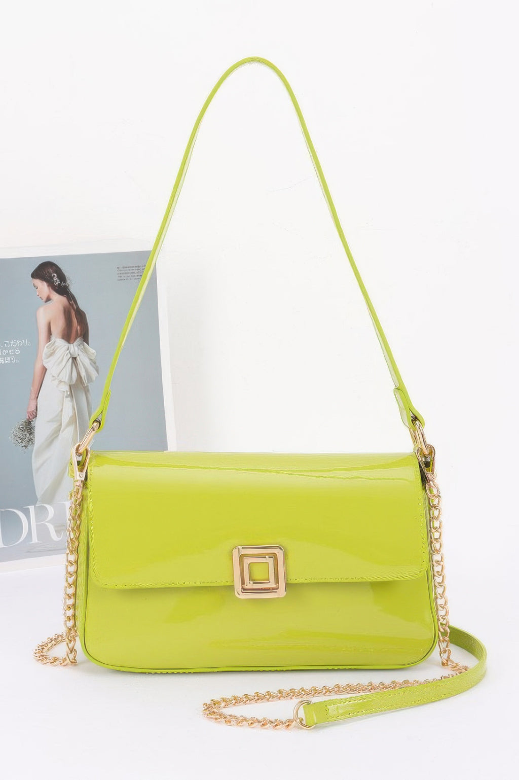 The Midnight Elegance Purse is a refined statement piece that brings polish and poise to any look. Crafted from high-shine enamel-finished polyurethane with sleek mixed metal accents, this flap shoulder bag adds a sophisticated edge to your ensemble. The structured silhouette, measuring 9.5 inches wide, 5.5 inches high, and 2.75 inches deep, offers ample space for essentials while maintaining a sleek profile. Finished with a chic chain strap, this versatile handbag transitions effortlessly from day to night, making it the perfect companion for both special occasions and elevated everyday wear.