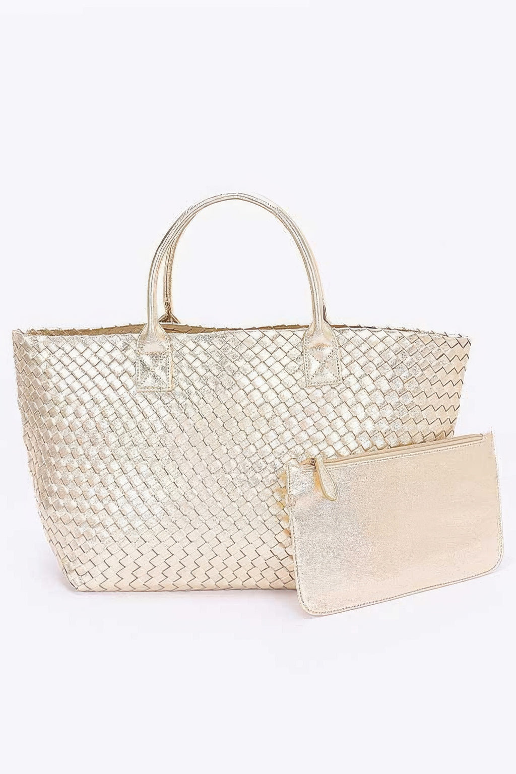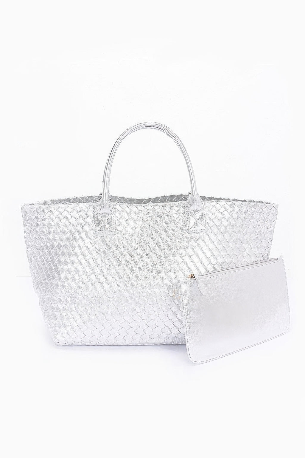 Elevate your accessory game with the Metallic Faux Leather Braided Tote Bag—a standout piece that blends texture, shine, and versatility. Crafted from high-quality polyurethane, this spacious tote features a beautifully braided exterior with a metallic finish that catches the light effortlessly. Designed to hold your daily essentials and more, it includes a matching purse for added convenience and style. Whether you're heading to work, shopping, or a weekend getaway, this tote delivers fashion-forward functionality with a polished edge.