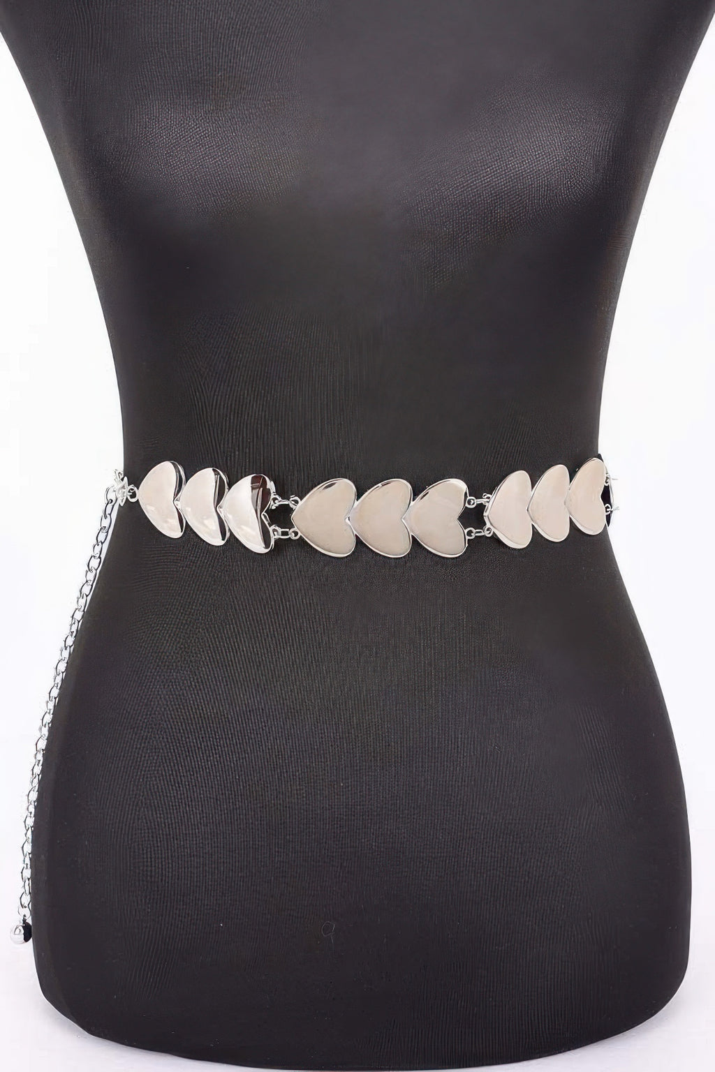 Design: The metal chain design is adorned with heart-shaped charms, adding a whimsical yet chic element to the belt. The combination of the chain and charms creates a striking contrast, making this accessory a statement piece.
