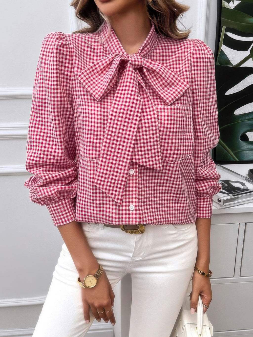 Plaid Puff Sleeves Loose Button Trim Knot Blouse